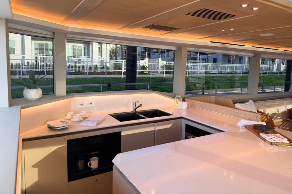 By positioning the primary galley below, the main deck remains dedicated to living and hosting — uninterrupted sightlines, refined furnishings, and a sense of volume typically reserved for much larger yachts. The result is a space that feels residential, not transactional.