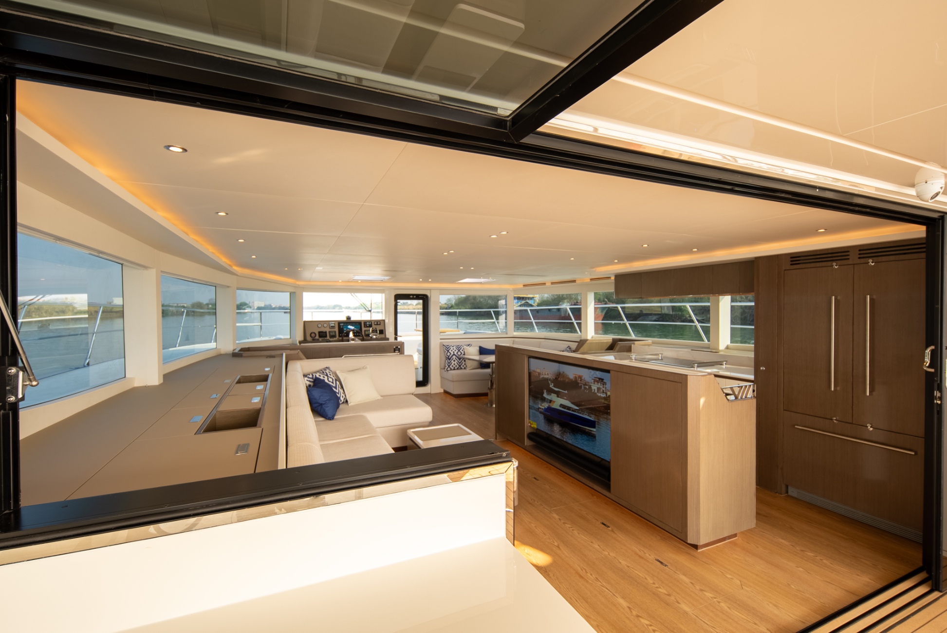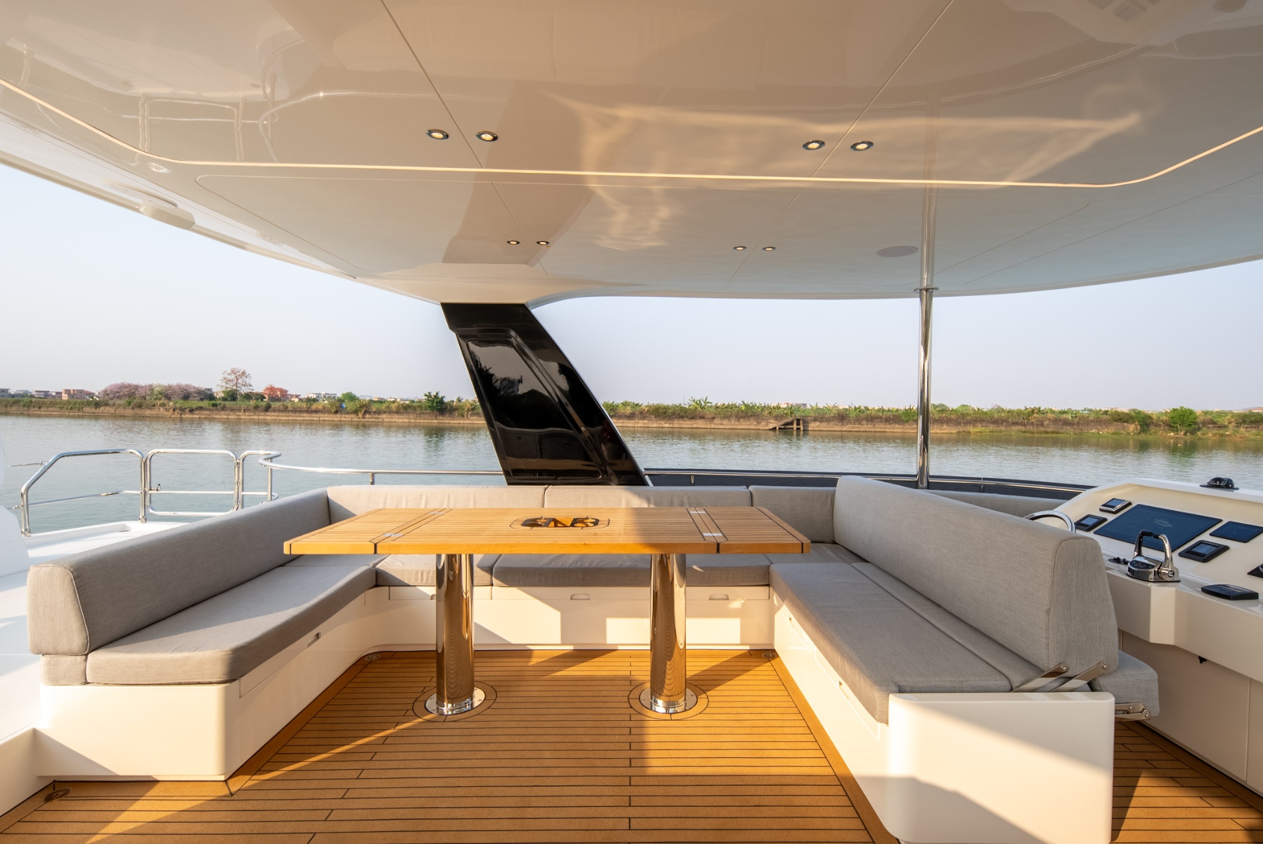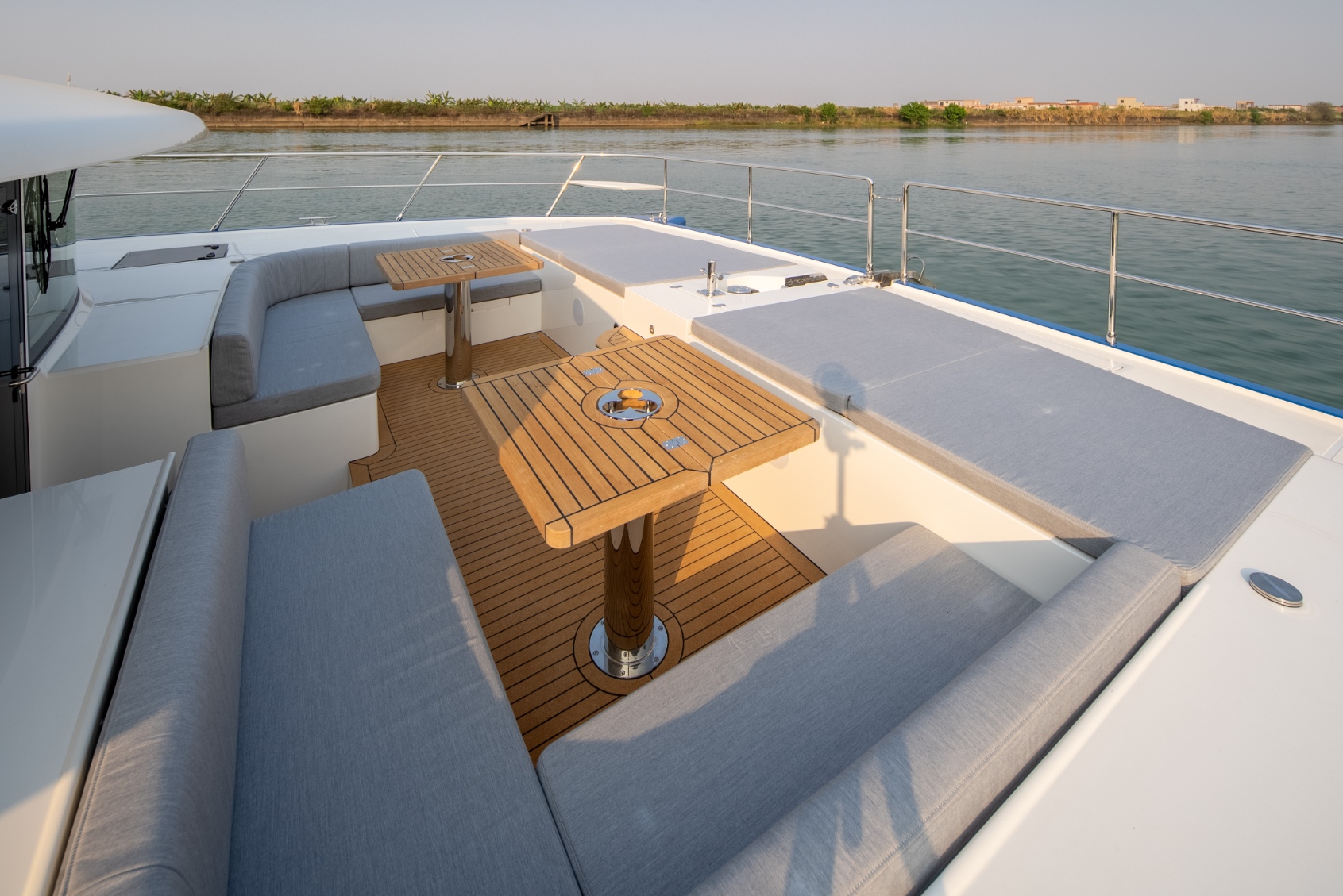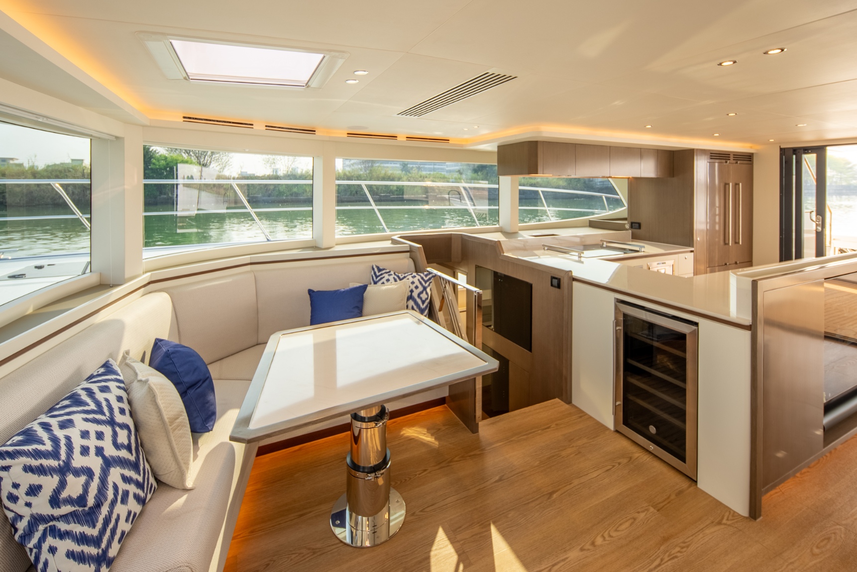 The unique flybridge wings provide ample open space for lounging, or a large tender, while providing cover for the cockpit. Fit out is sumptuous throughout, using class leading components.