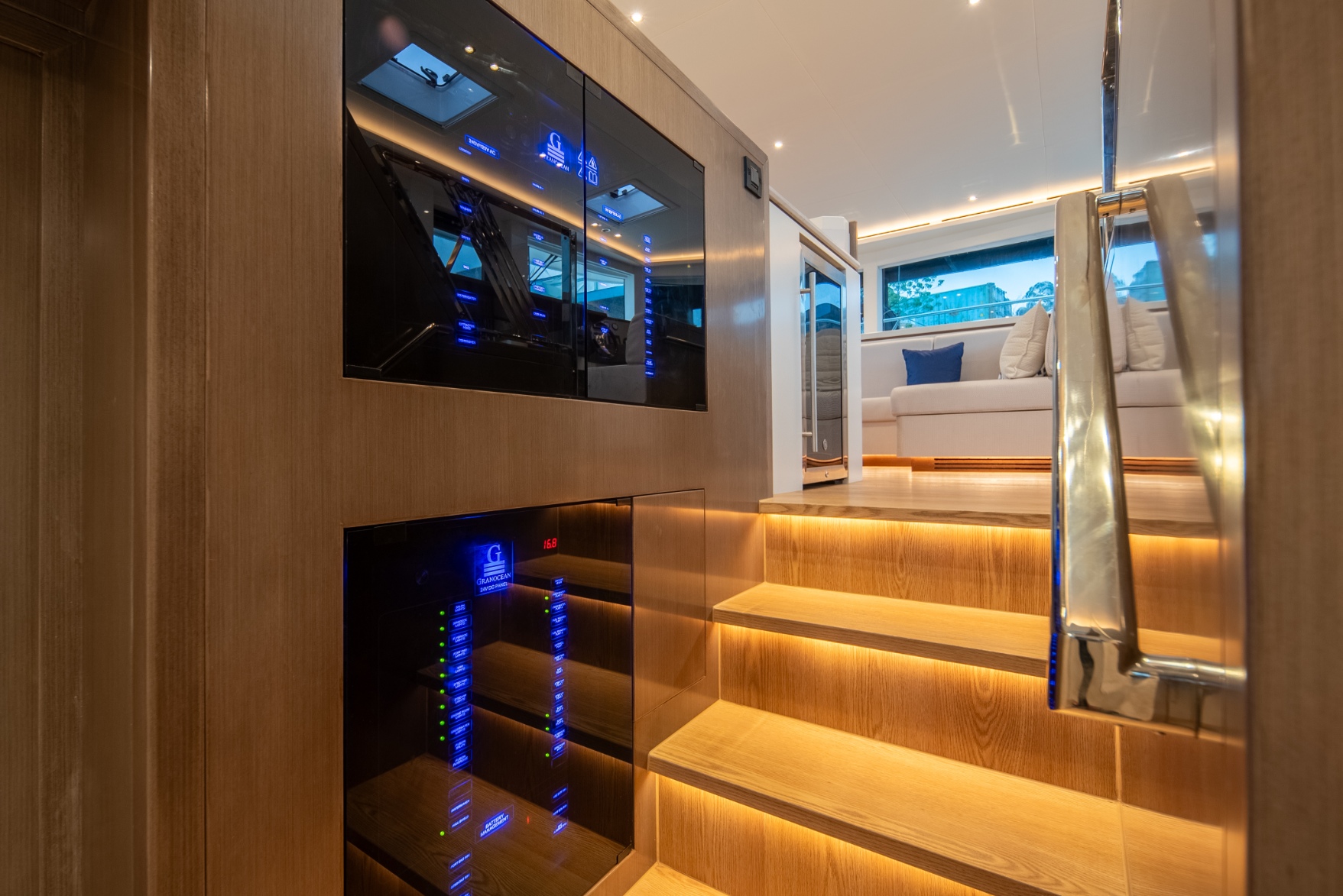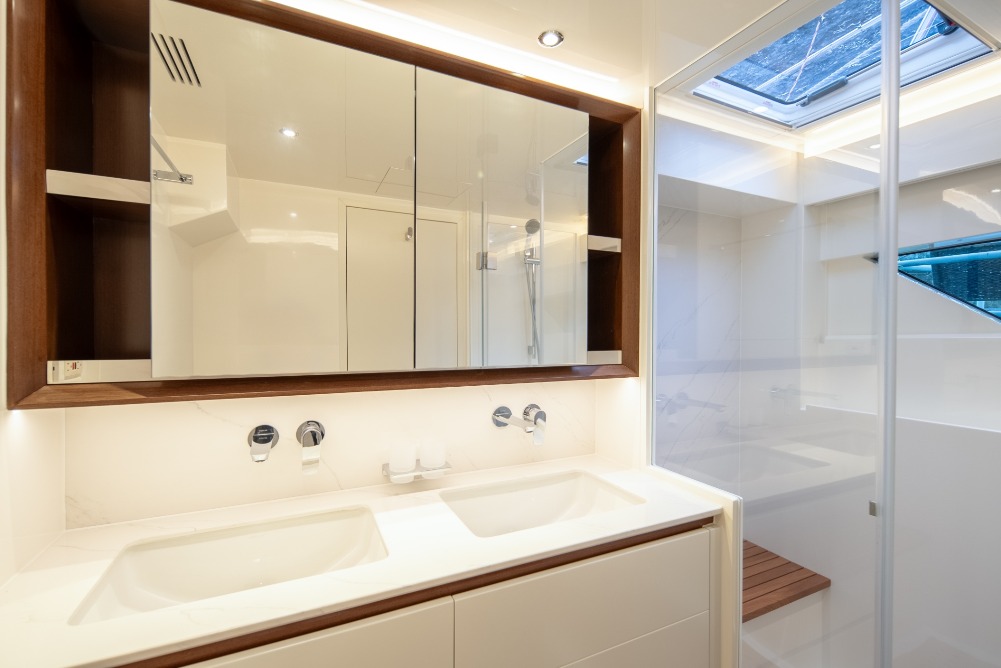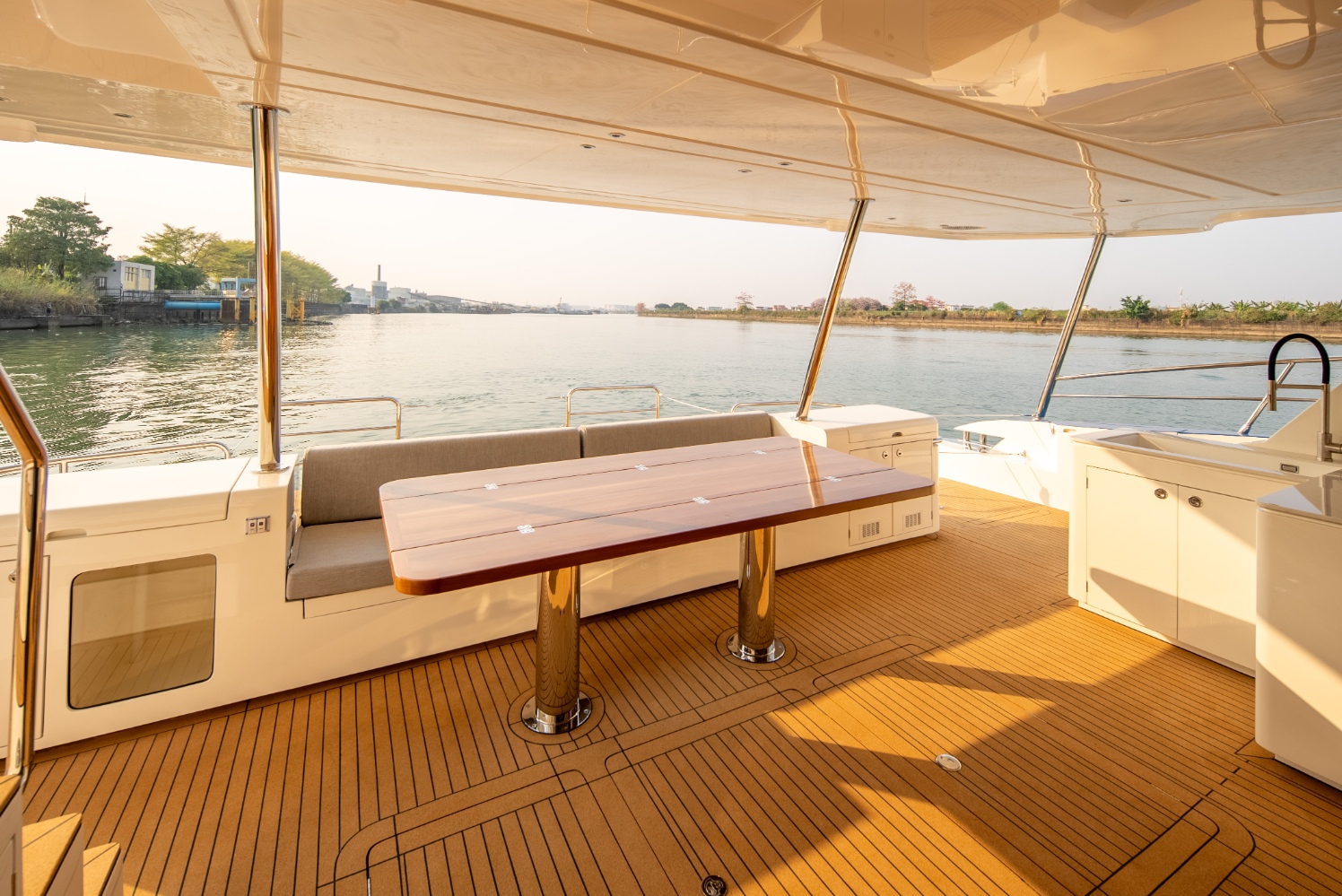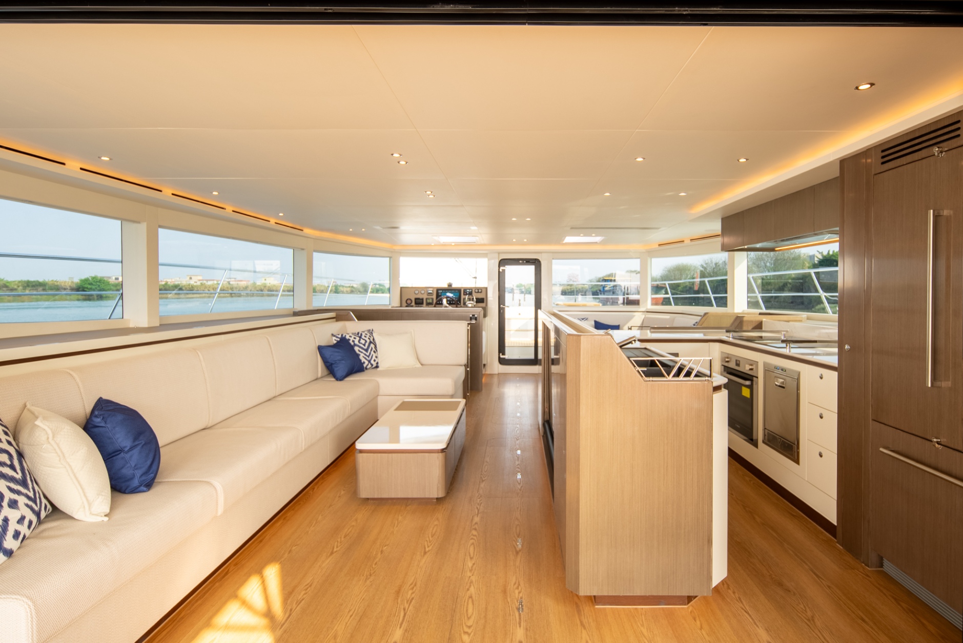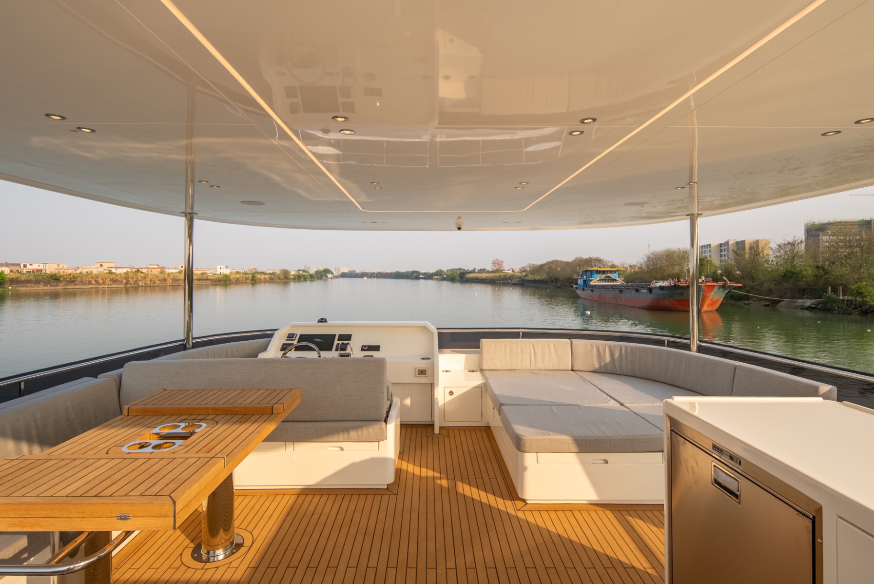 The unique flybridge wings provide ample open space for lounging, or a large tender, while providing cover for the cockpit. Fit out is sumptuous throughout, using class leading components.