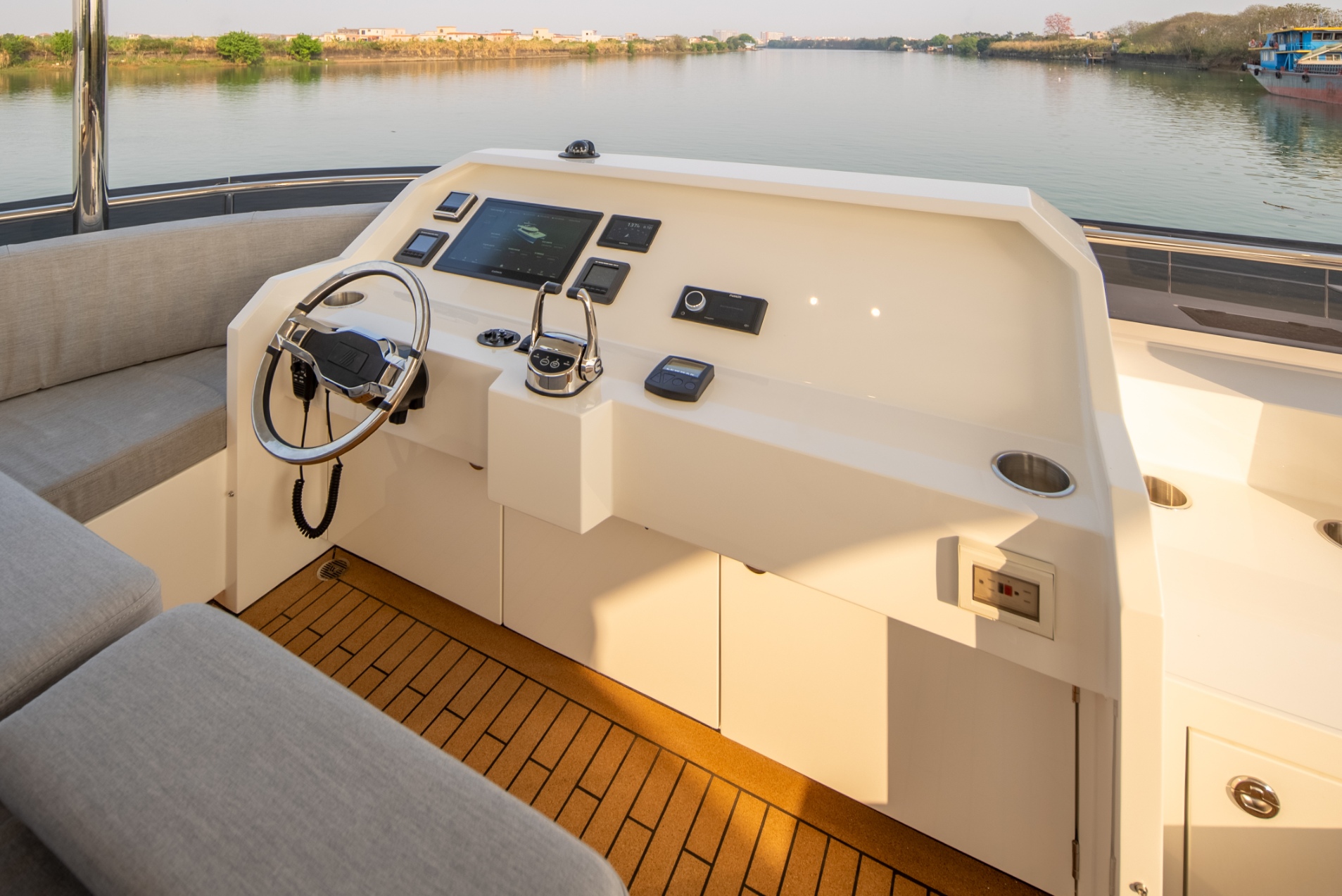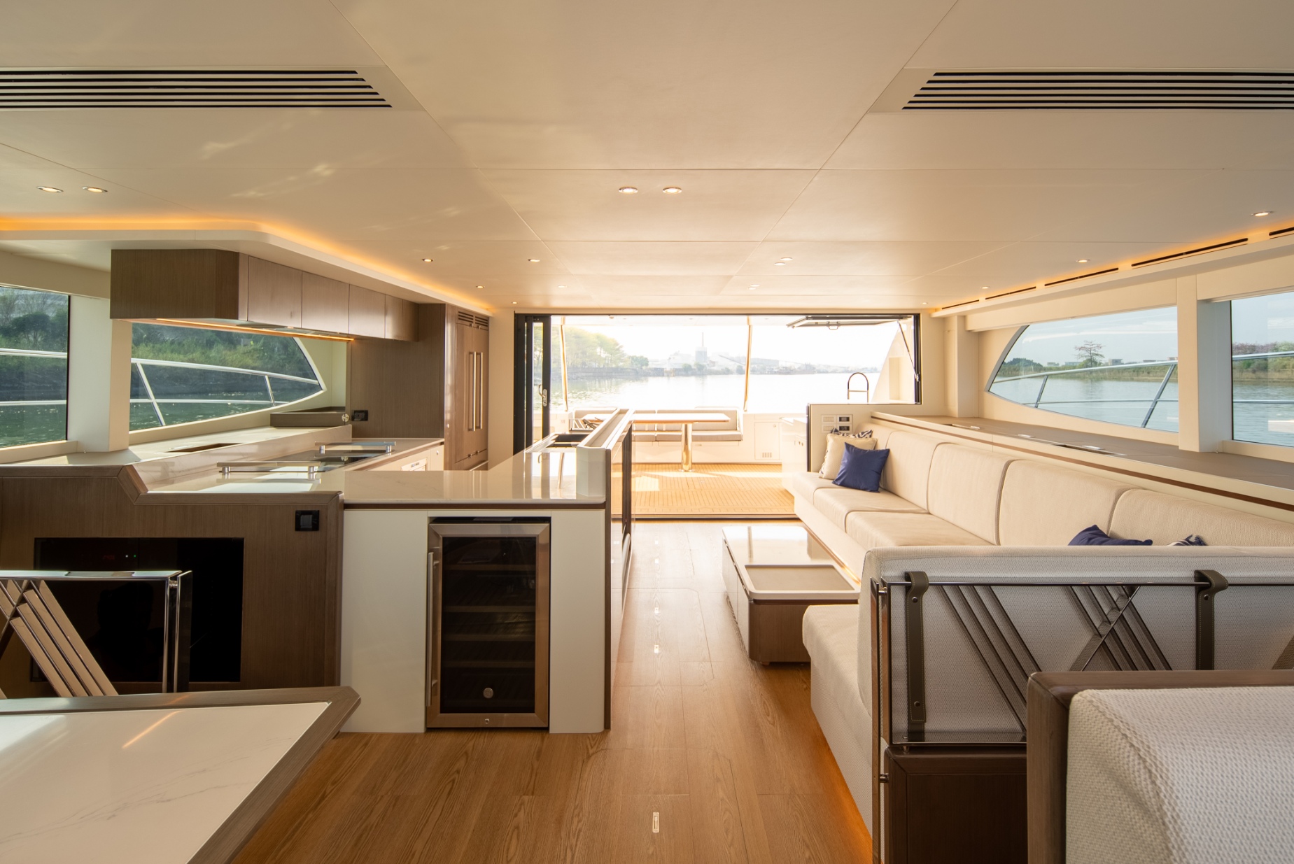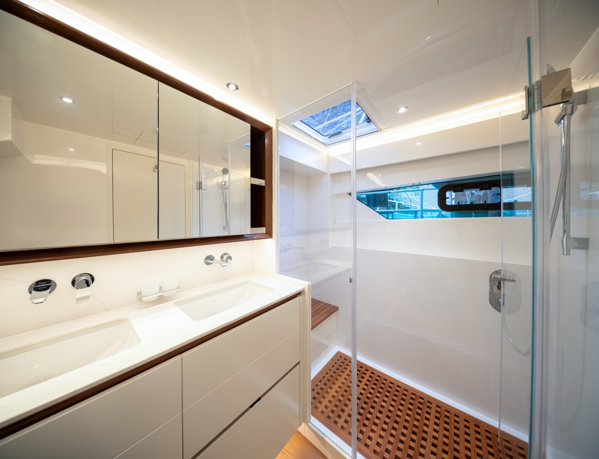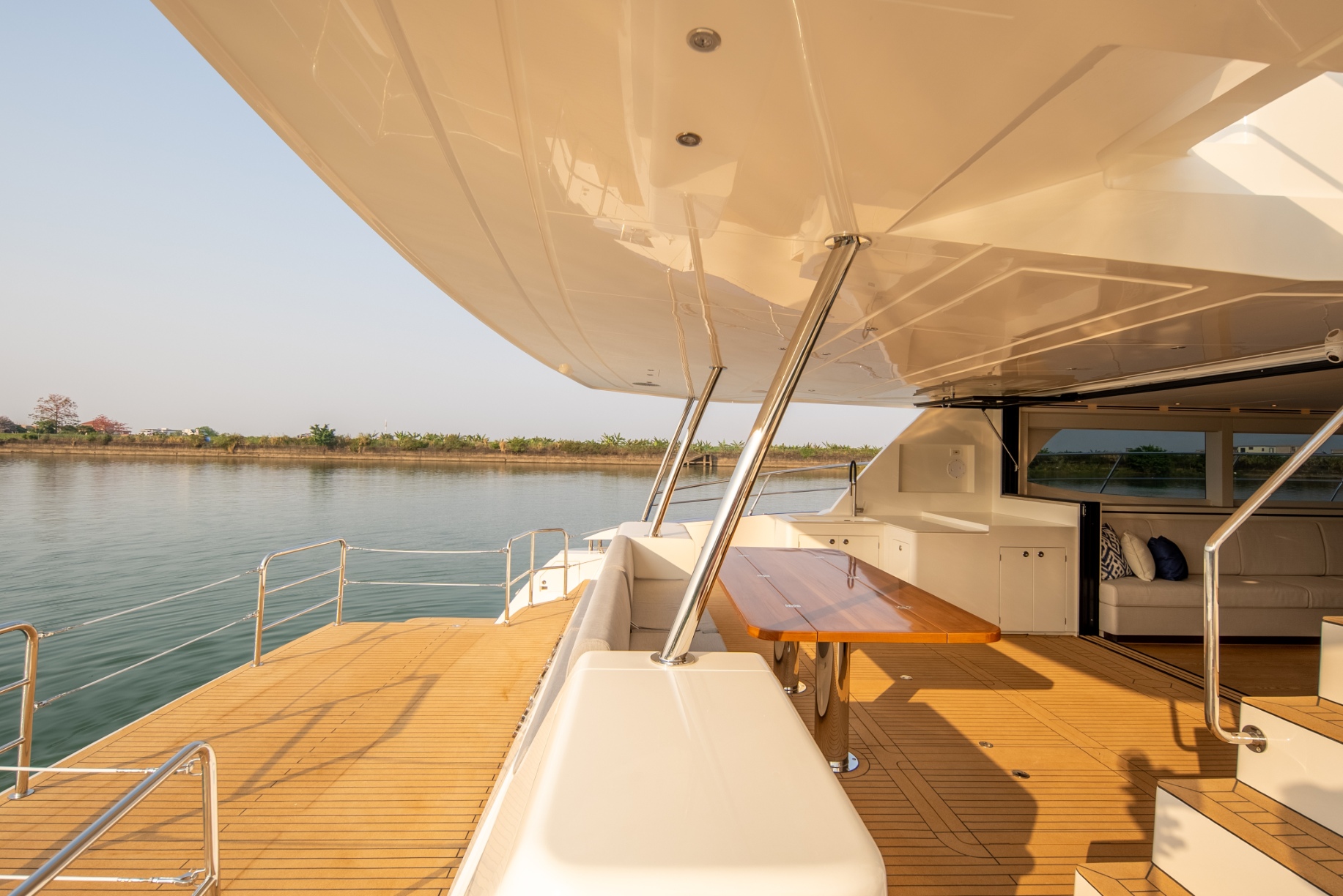 The unique flybridge wings provide ample open space for lounging, or a large tender, while providing cover for the cockpit. Fit out is sumptuous throughout, using class leading components.