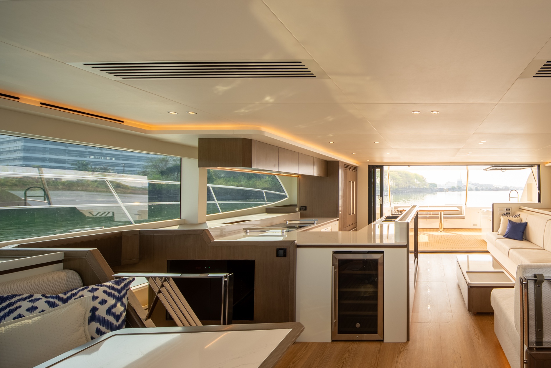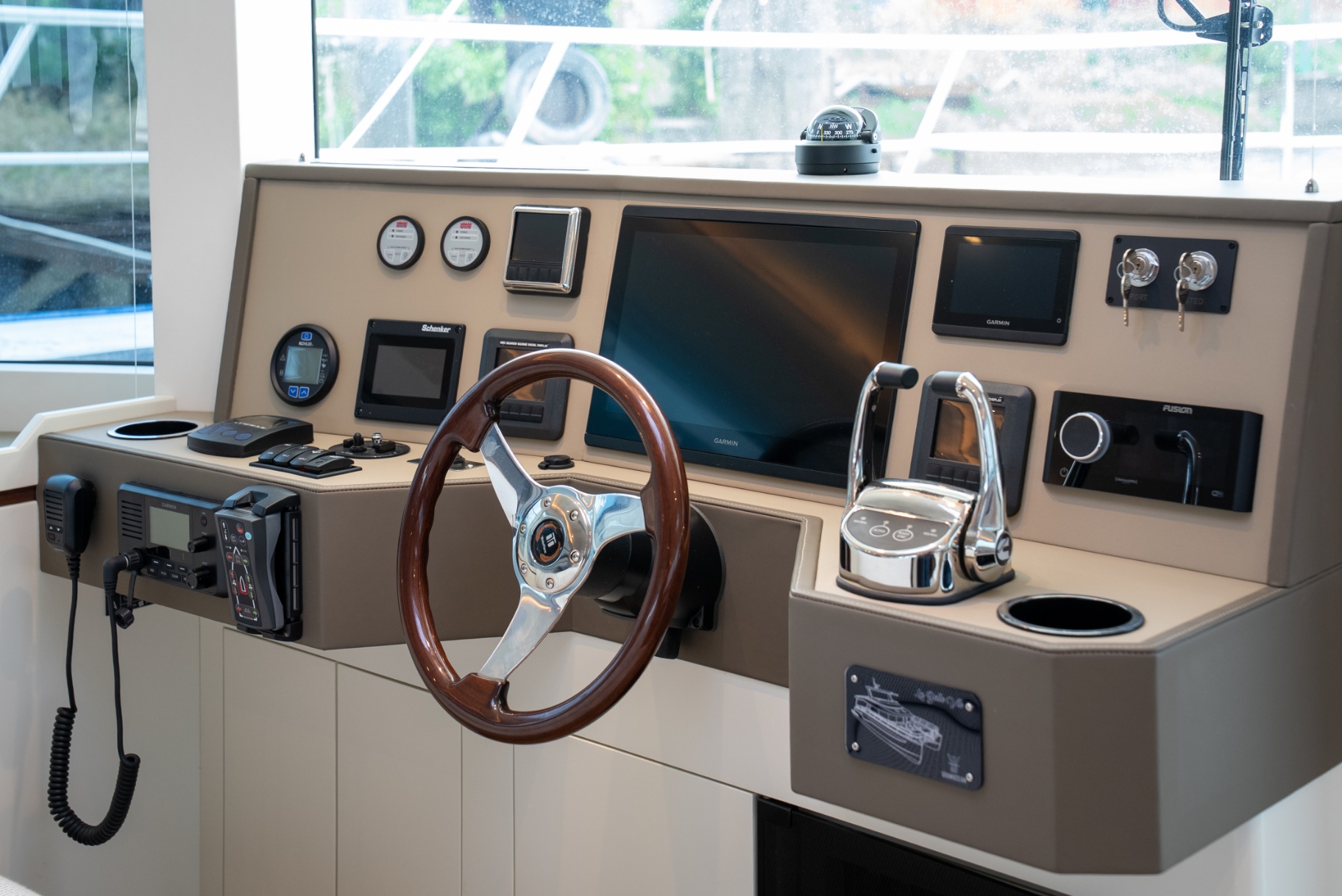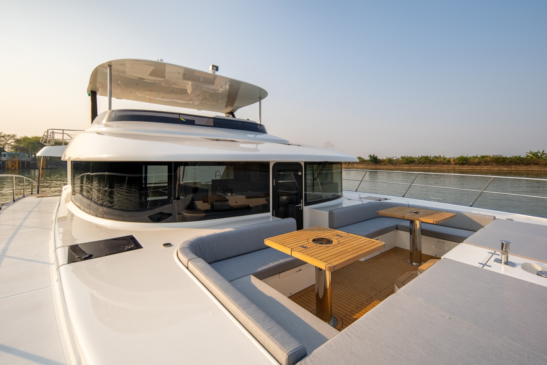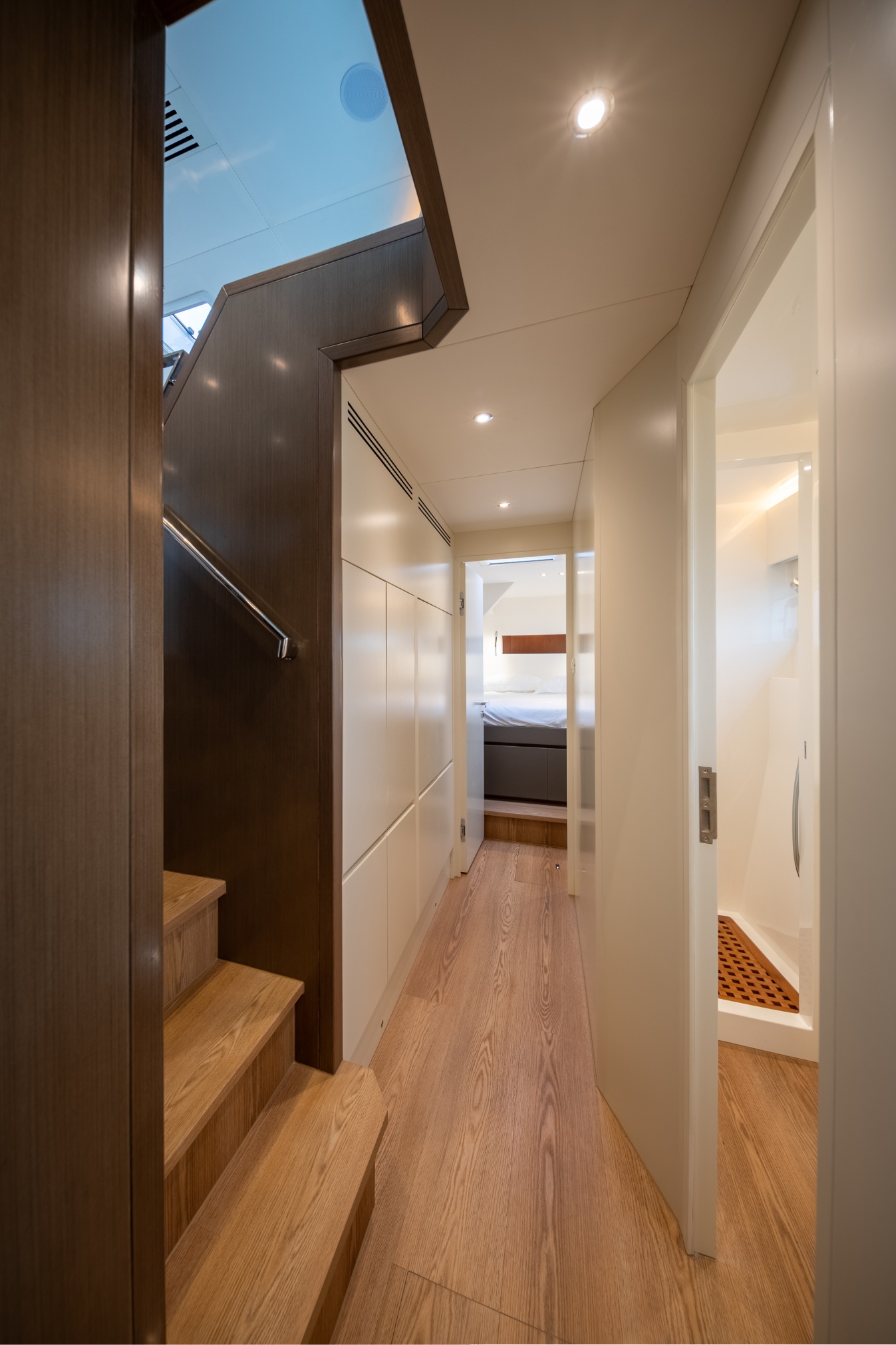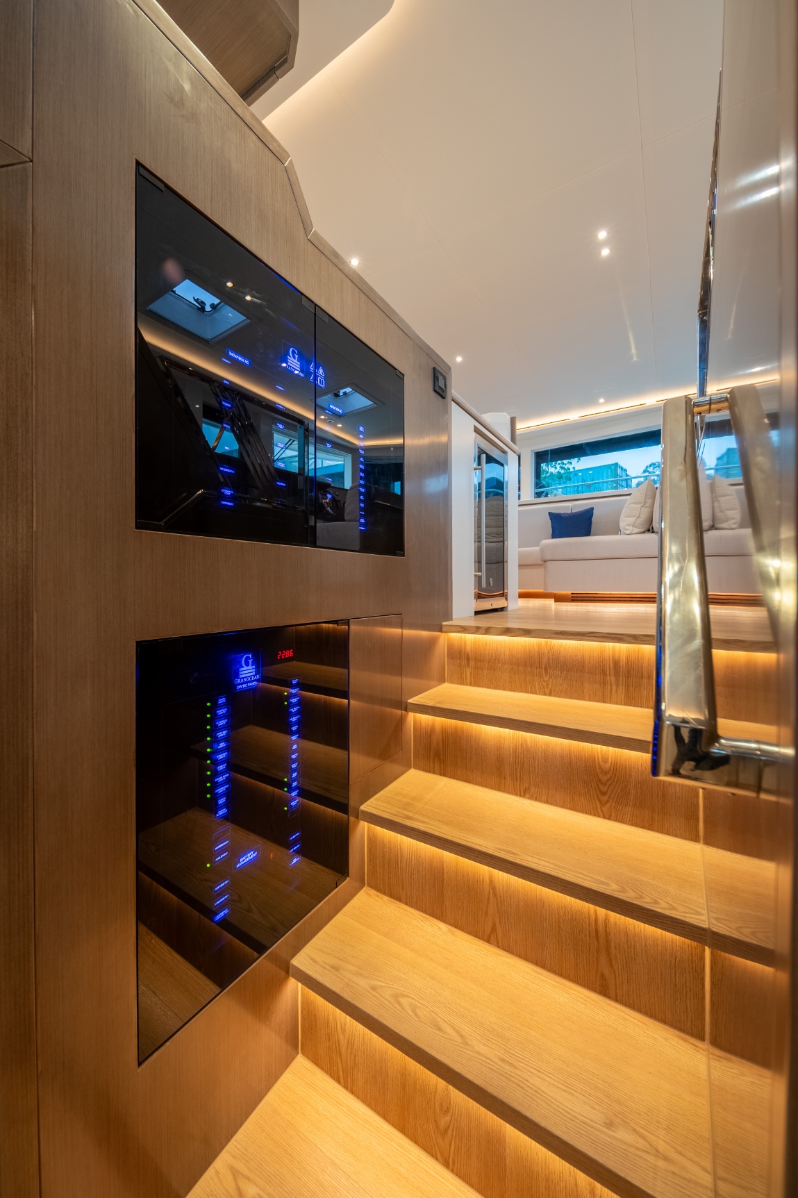 The unique flybridge wings provide ample open space for lounging, or a large tender, while providing cover for the cockpit. Fit out is sumptuous throughout, using class leading components.